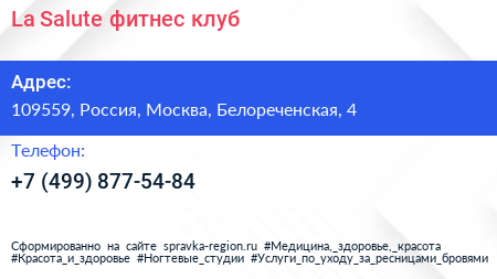 La Salute, фитнес-клуб по адресу 109559, Россия, Москва, Белореченская, 4 в дальнейшем Организация, размещена в следующих категориях: