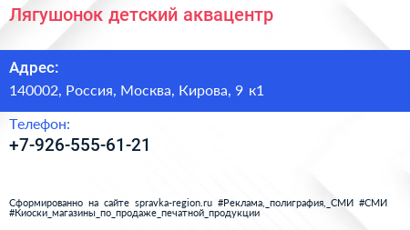 Лягушонок, детский аквацентр по адресу 140002, Россия, Москва, Кирова, 9 к1 в дальнейшем Организация, размещена в следующих категориях: