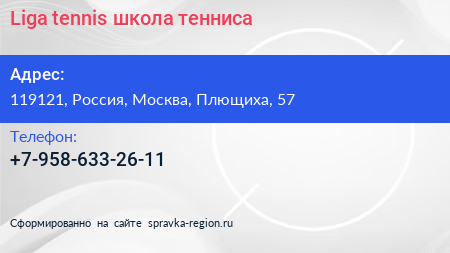 Liga tennis, школа тенниса по адресу 119121, Россия, Москва, Плющиха, 57 в дальнейшем Организация, размещена в следующих категориях: