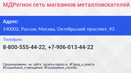 МДРегион, сеть магазинов металлоискателей по адресу 140002, Россия, Москва, Октябрьский проспект, 93 в дальнейшем Организация, размещена в следующих категориях: