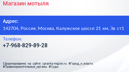 Магазин мотыля по адресу 142704, Россия, Москва, Калужское шоссе 21 км, 3в ст1 в дальнейшем Организация, размещена в следующих категориях: