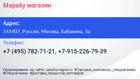 Марабу, магазин по адресу 141407, Россия, Москва, Бабакина, 5а в дальнейшем Организация, размещена в следующих категориях: