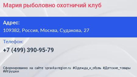 Мария, рыболовно-охотничий клуб по адресу 109382, Россия, Москва, Судакова, 27 в дальнейшем Организация, размещена в следующих категориях: