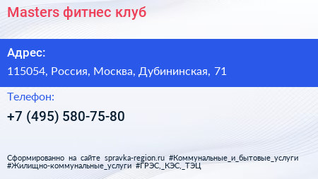 Masters, фитнес-клуб по адресу 115054, Россия, Москва, Дубининская, 71 в дальнейшем Организация, размещена в следующих категориях: