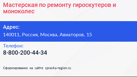 Мастерская по ремонту гироскутеров и моноколес по адресу 140011, Россия, Москва, Авиаторов, 15 в дальнейшем Организация, размещена в следующих категориях: