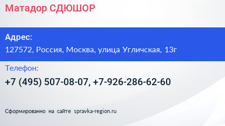 Матадор, СДЮШОР по адресу 127572, Россия, Москва, улица Угличская, 13г в дальнейшем Организация, размещена в следующих категориях:
