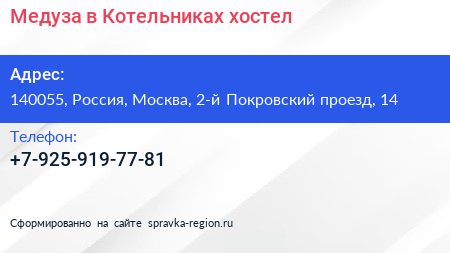 Медуза в Котельниках, хостел по адресу 140055, Россия, Москва, 2-й Покровский проезд, 14 в дальнейшем Организация, размещена в следующих категориях: