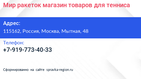 Мир ракеток, магазин товаров для тенниса по адресу 115162, Россия, Москва, Мытная, 48 в дальнейшем Организация, размещена в следующих категориях: