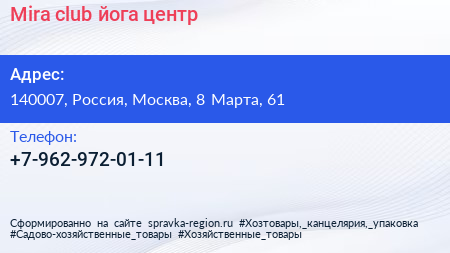 Mira club, йога-центр по адресу 140007, Россия, Москва, 8 Марта, 61 в дальнейшем Организация, размещена в следующих категориях: