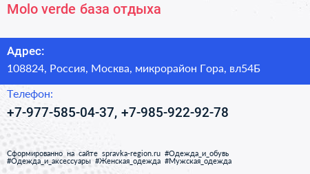 Molo verde, база отдыха по адресу 108824, Россия, Москва, микрорайон Гора, вл54Б в дальнейшем Организация, размещена в следующих категориях: