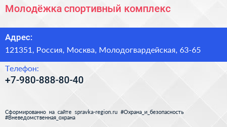 Молодёжка, спортивный комплекс по адресу 121351, Россия, Москва, Молодогвардейская, 63-65 в дальнейшем Организация, размещена в следующих категориях: