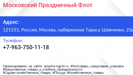 Московский Праздничный Флот по адресу 121151, Россия, Москва, набережная Тараса Шевченко, 23а в дальнейшем Организация, размещена в следующих категориях:
