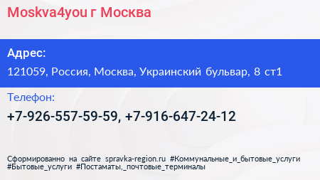 Moskva4you, г. Москва по адресу 121059, Россия, Москва, Украинский бульвар, 8 ст1 в дальнейшем Организация, размещена в следующих категориях: