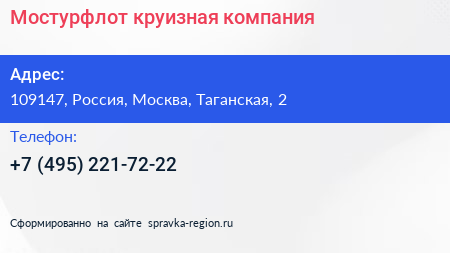 Мостурфлот, круизная компания по адресу 109147, Россия, Москва, Таганская, 2 в дальнейшем Организация, размещена в следующих категориях: