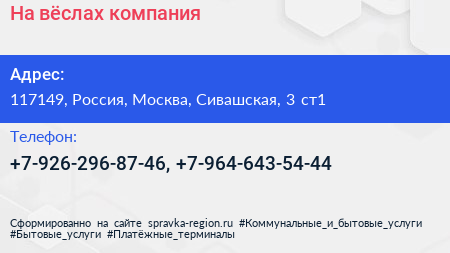 Для связи с организацией воспользуйтесь номером телефона: +7-926-296-87-46, +7-964-643-54-44. Ежедневно с 10:00 до 22:00, вы можете обратиться в эту организацию.