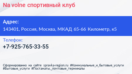 Na volne, спортивный клуб по адресу 143401, Россия, Москва, МКАД 65-66 Километр, к5 в дальнейшем Организация, размещена в следующих категориях: