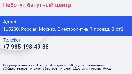 Неботут, батутный центр по адресу 115230, Россия, Москва, Электролитный проезд, 3 ст2 в дальнейшем Организация, размещена в следующих категориях:
