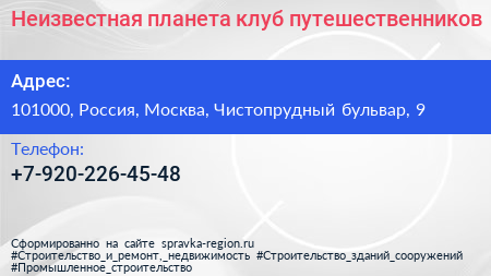 Неизвестная планета, клуб путешественников по адресу 101000, Россия, Москва, Чистопрудный бульвар, 9 в дальнейшем Организация, размещена в следующих категориях: