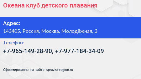 Океана, клуб детского плавания по адресу 143405, Россия, Москва, Молодёжная, 3 в дальнейшем Организация, размещена в следующих категориях: