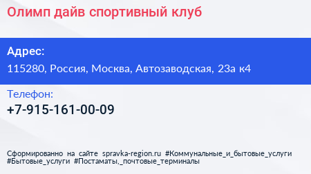 Олимп дайв, спортивный клуб по адресу 115280, Россия, Москва, Автозаводская, 23а к4 в дальнейшем Организация, размещена в следующих категориях: