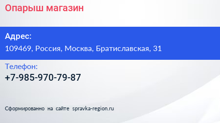 Опарыш, магазин по адресу 109469, Россия, Москва, Братиславская, 31 в дальнейшем Организация, размещена в следующих категориях: