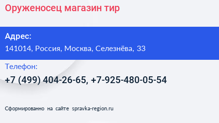 Оруженосец, магазин-тир по адресу 141014, Россия, Москва, Селезнёва, 33 в дальнейшем Организация, размещена в следующих категориях: