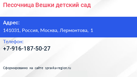 Песочница Вешки, детский сад по адресу 141031, Россия, Москва, Лермонтова, 1 в дальнейшем Организация, размещена в следующих категориях: