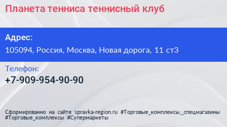 Планета тенниса, теннисный клуб по адресу 105094, Россия, Москва, Новая дорога, 11 ст3 в дальнейшем Организация, размещена в следующих категориях: