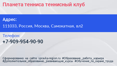 Планета тенниса, теннисный клуб по адресу 111033, Россия, Москва, Самокатная, вл2 в дальнейшем Организация, размещена в следующих категориях: