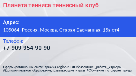 Планета тенниса, теннисный клуб по адресу 105064, Россия, Москва, Старая Басманная, 15а ст4 в дальнейшем Организация, размещена в следующих категориях:
