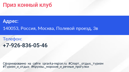 Приз, конный клуб по адресу 140053, Россия, Москва, Полевой проезд, 3в в дальнейшем Организация, размещена в следующих категориях: