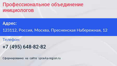 Профессиональное объединение инициологов по адресу 123112, Россия, Москва, Пресненская Набережная, 12 в дальнейшем Организация, размещена в следующих категориях: