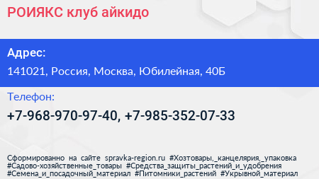 РОИЯКС, клуб айкидо по адресу 141021, Россия, Москва, Юбилейная, 40Б в дальнейшем Организация, размещена в следующих категориях: