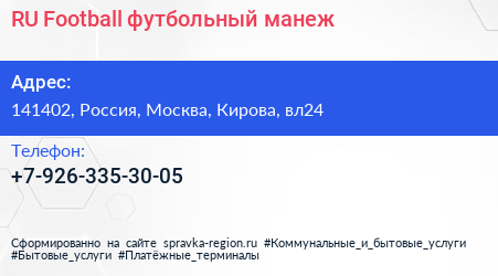 RU Football, футбольный манеж по адресу 141402, Россия, Москва, Кирова, вл24 в дальнейшем Организация, размещена в следующих категориях: