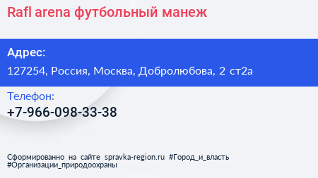 Rafl arena, футбольный манеж по адресу 127254, Россия, Москва, Добролюбова, 2 ст2а в дальнейшем Организация, размещена в следующих категориях: