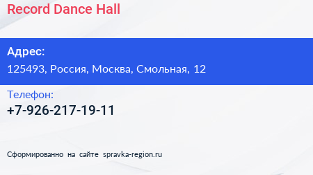Record Dance Hall по адресу 125493, Россия, Москва, Смольная, 12 в дальнейшем Организация, размещена в следующих категориях: