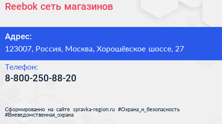 Reebok, сеть магазинов по адресу 123007, Россия, Москва, Хорошёвское шоссе, 27 в дальнейшем Организация, размещена в следующих категориях: