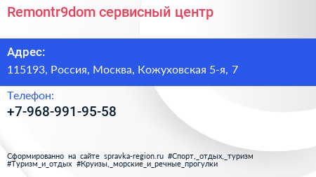 Remontr9dom, сервисный центр по адресу 115193, Россия, Москва, Кожуховская 5-я, 7 в дальнейшем Организация, размещена в следующих категориях: