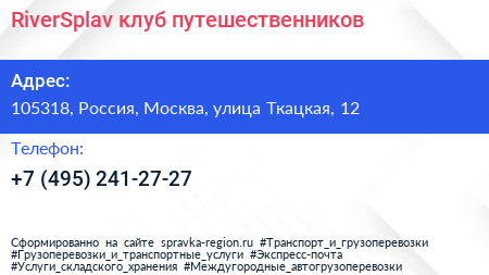 RiverSplav, клуб путешественников по адресу 105318, Россия, Москва, улица Ткацкая, 12 в дальнейшем Организация, размещена в следующих категориях: