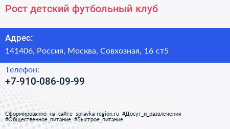 Рост, детский футбольный клуб по адресу 141406, Россия, Москва, Совхозная, 16 ст5 в дальнейшем Организация, размещена в следующих категориях: