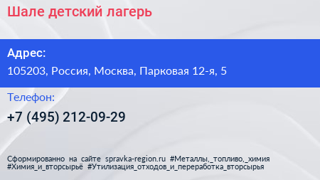 Шале, детский лагерь по адресу 105203, Россия, Москва, Парковая 12-я, 5 в дальнейшем Организация, размещена в следующих категориях: