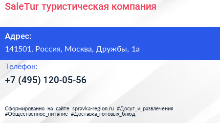 SaleTur, туристическая компания по адресу 141501, Россия, Москва, Дружбы, 1а в дальнейшем Организация, размещена в следующих категориях: