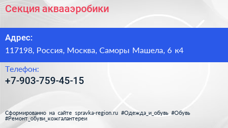 Секция аквааэробики по адресу 117198, Россия, Москва, Саморы Машела, 6 к4 в дальнейшем Организация, размещена в следующих категориях: