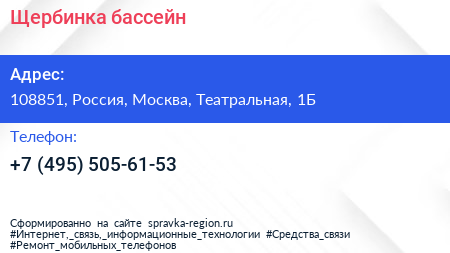 Щербинка, бассейн по адресу 108851, Россия, Москва, Театральная, 1Б в дальнейшем Организация, размещена в следующих категориях: