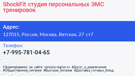 ShockFit, студия персональных ЭМС-тренировок по адресу 127015, Россия, Москва, Вятская, 27 ст7 в дальнейшем Организация, размещена в следующих категориях: