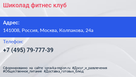 Шиколад, фитнес-клуб по адресу 141008, Россия, Москва, Колпакова, 24а в дальнейшем Организация, размещена в следующих категориях: