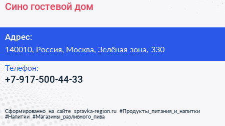 Сино, гостевой дом по адресу 140010, Россия, Москва, Зелёная зона, 330 в дальнейшем Организация, размещена в следующих категориях:
