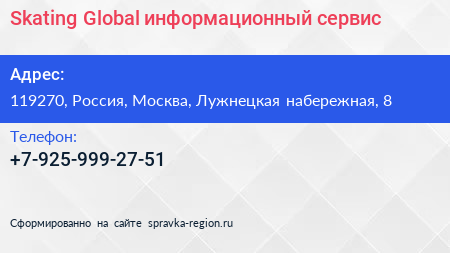 Skating Global, информационный сервис по адресу 119270, Россия, Москва, Лужнецкая набережная, 8 в дальнейшем Организация, размещена в следующих категориях: