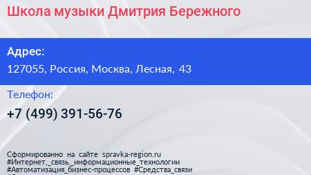 Школа музыки Дмитрия Бережного по адресу 127055, Россия, Москва, Лесная, 43 в дальнейшем Организация, размещена в следующих категориях: