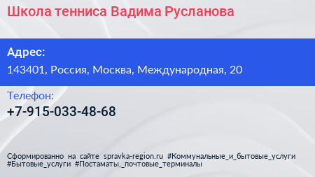Школа тенниса Вадима Русланова по адресу 143401, Россия, Москва, Международная, 20 в дальнейшем Организация, размещена в следующих категориях: